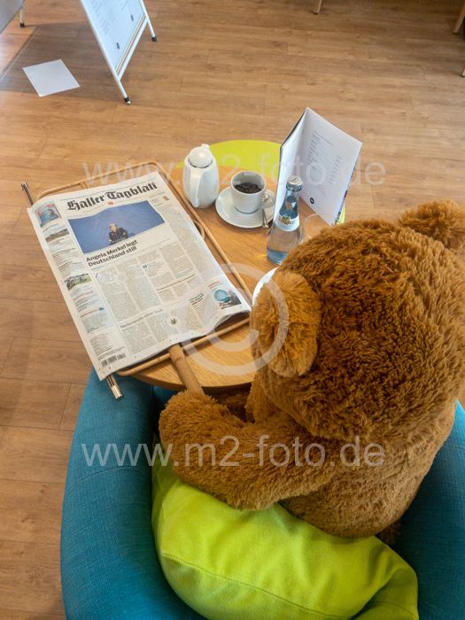 Feature, Blick über die Schulter eines Abstands Bären, er liest die letzte geheftete Ausgabe des Haller Tagblatt, mit dem passenden Aufhänger "Angela Merkel legt Deutschland still".