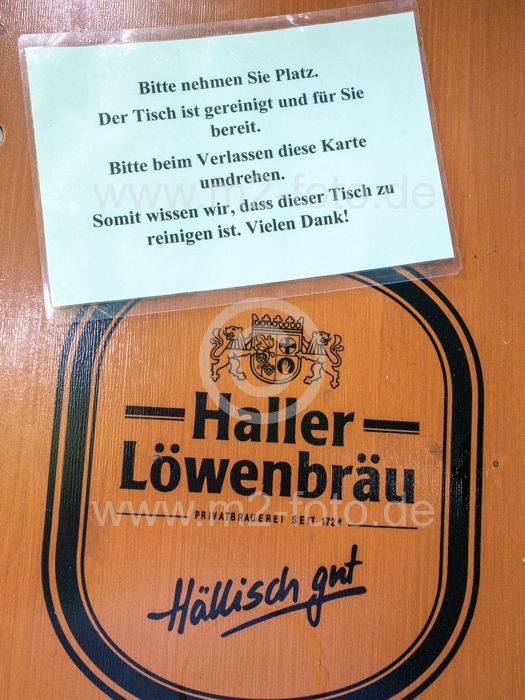 Feature, Hinweis im Biergarten Unterwöhrd auf den Biertischen.