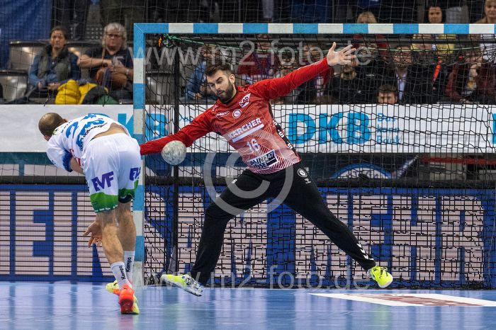 Marcel Schiller (Frisch Auf! Goeppingen) und Torwart Milan Vujovic (TVB 1898 Stuttgart).