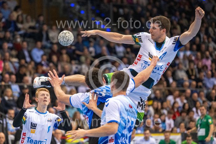 Tobias Ellebaek (Frisch Auf! Goeppingen) und Marino Maric (TVB 1898 Stuttgart).