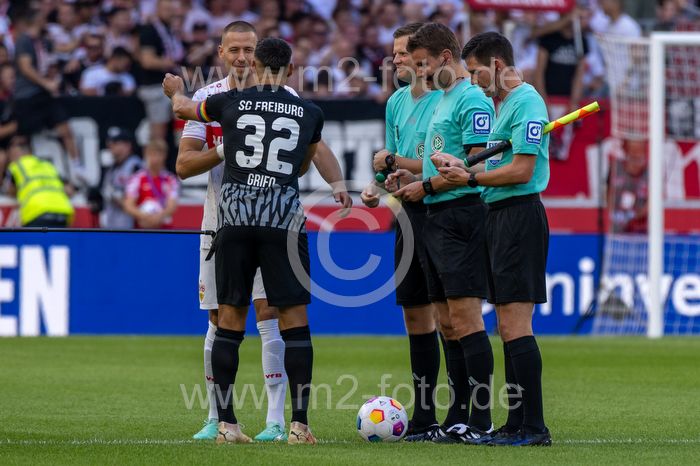 Waldemar Anton (VfB Stuttgart), Vincenzo Grifo (SC Freiburg) und das Schiedsrichtergespann um Schiedsrichter Felix Brych bei der Platzwahl.