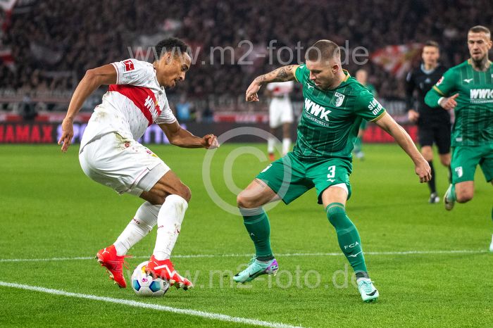 Jamie Leweling (VfB Stuttgart) und Mads Pedersen (FC Augsburg).