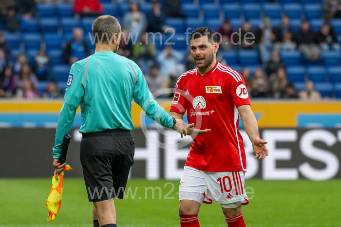 Kevin Volland (1.FC Union Berlin) beschwert sich beim Schiedsrichter-Assistent Christian Leicher.