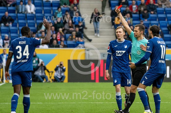 Schiedsrichter Robert Hartmann zeigt Stanley Nskoi (TSG 1899 Hoffenheim) die gelb-rote Karte.