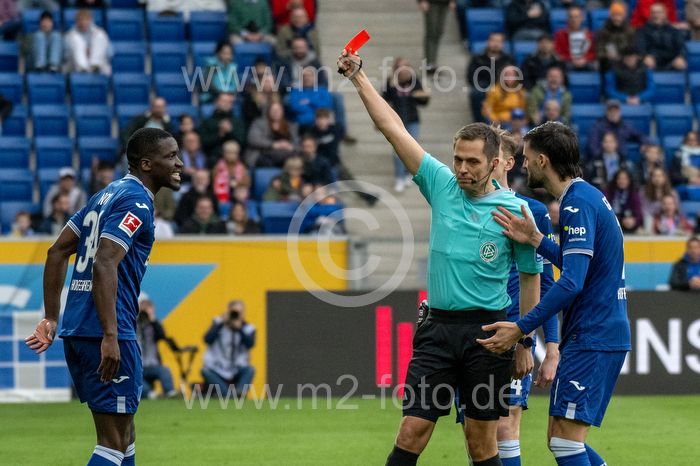 Schiedsrichter Robert Hartmann zeigt Stanley Nskoi (TSG 1899 Hoffenheim) die gelb-rote Karte.