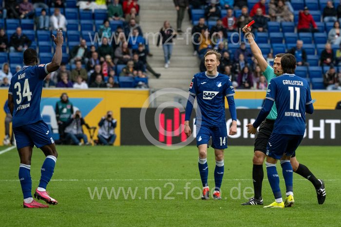Schiedsrichter Robert Hartmann zeigt Stanley Nskoi (TSG 1899 Hoffenheim) die gelb-rote Karte.