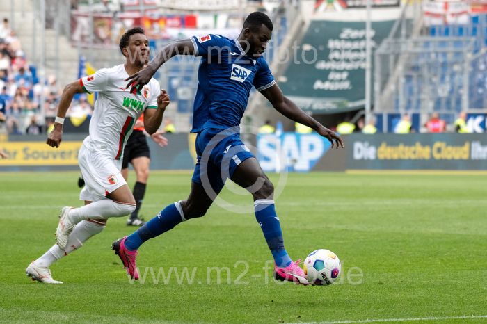 Ihlas Bebou (TSG 1899 Hoffenheim) auf dem Weg zum 3:1, Felix Uduokhai (FC Augsburg) kann nicht folgen.