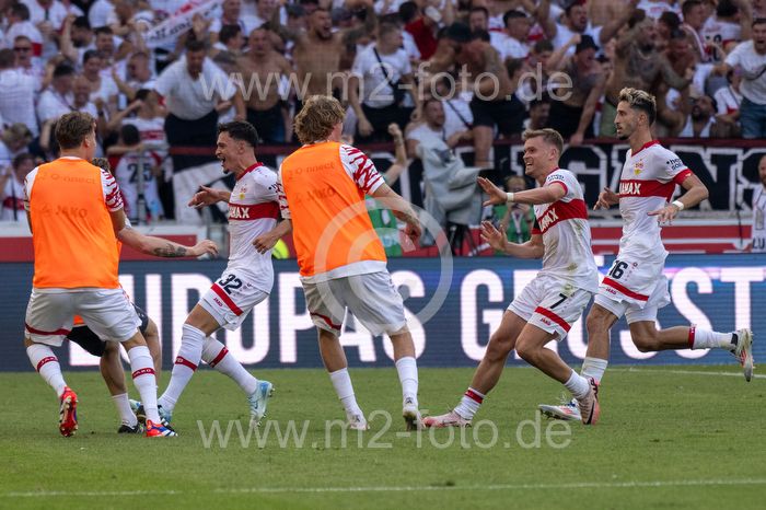 Torjubel des Torschützen Fabian Rieder (VfB Stuttgart), Jubel und Freude bei Nick Woltemade, Maximilian Mittelstädt und Atakan Karazor (VfB Stuttgart)