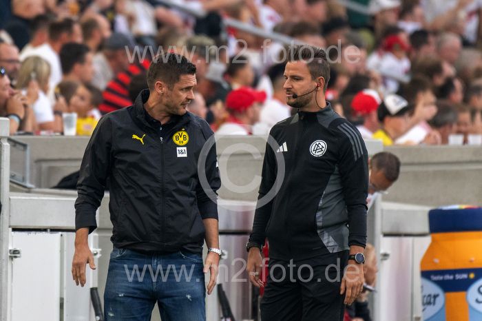 Sportdirektor Sebastian Kehl (Borussia Dortmund) hat Redebedarf mit dem Vierter Offizieller Daniel Schlager.
