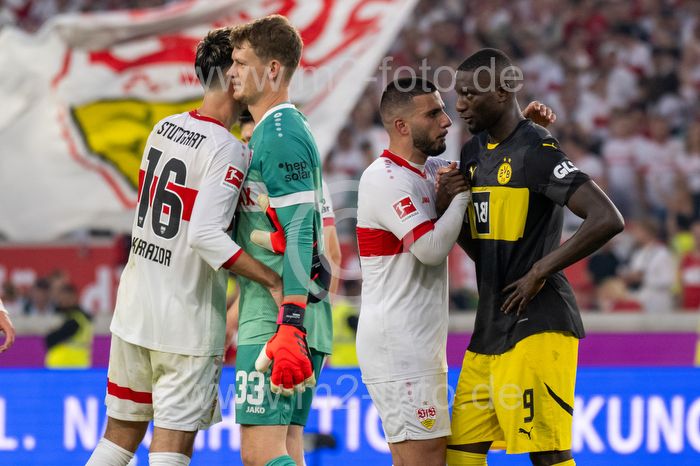 Atakan Karazor, Torwart Alexander Nübel, Deniz Undav (VfB Stuttgart) und Serhou Guirassy (Borussia Dortmund).