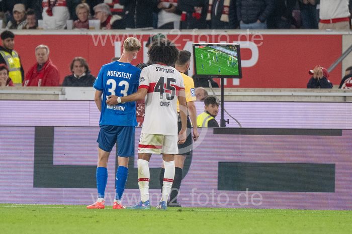 Schiedsrichter Harm Osmers schaut sich die Szene nochmals an, Max Moerstedt (TSG 1899 Hoffenheim) und Anrie Chase (VfB Stuttgart) schauen Ihm über die Schulter.