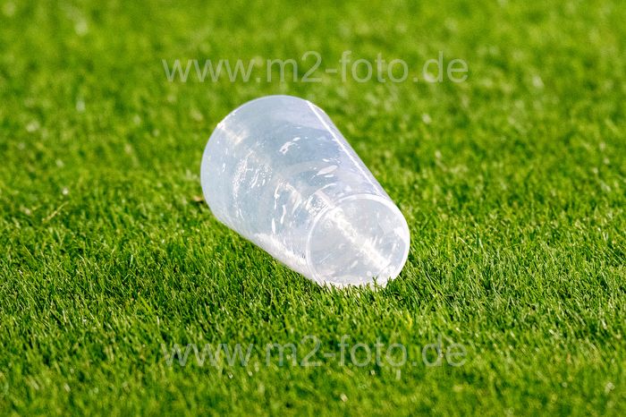Feature, Symbolbild, leerer Bierbecher auf dem Spielfeld.