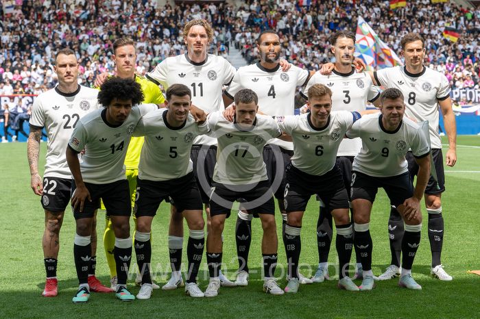 Die Startelf h.r.v.l David Raum, Torwart Marc-Andre ter Stegen, Nick Woltemade, Johnathan Tah, Robin Koch, Leon Goretzka (GER), v.r.v.l. Karim Adeyemi, Pascal Groß, Florian Wirtz, Joshua Kimmich und Niclas Füllkrug (GER).
