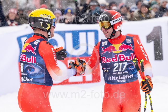 Nach 217 Worldcup Races sagt Beat Feuz (SUI) tschüß, sein Teamkollege Niels Hintermann (SUI) gratuliert Ihm.