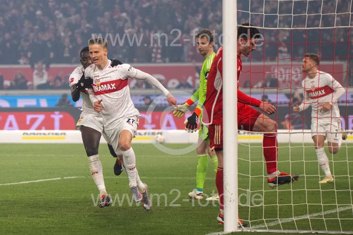 Torjubel des Torsch tzen Chris Führich (VfB Stuttgart), Jubel und Freude bei Serhou Guirassy (VfB Stuttgart), Frust bei Robin Gosens (1.FC Union Berlin).