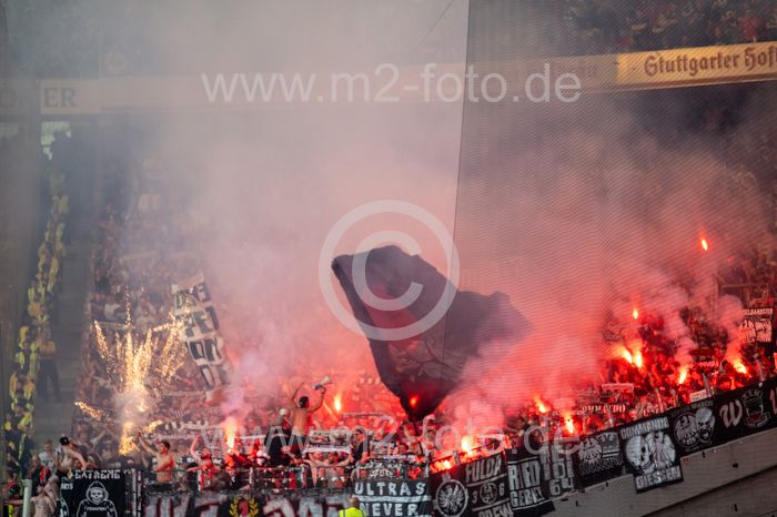 Bengalos, pyrotechnics, Rauch steigt auf im Eintracht Fanblock.