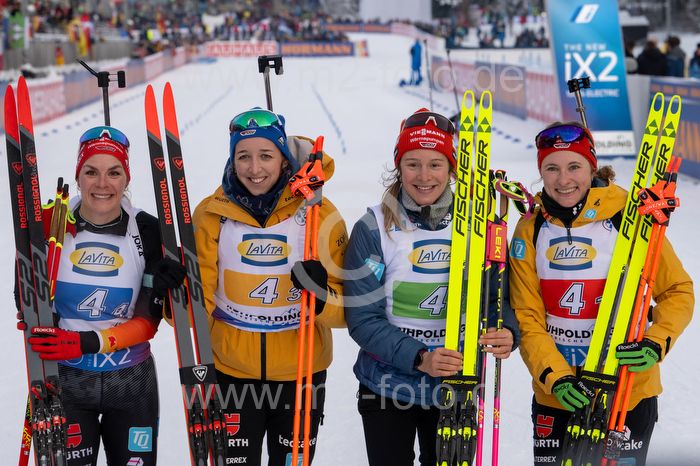 Jubel und Freude bei der deutschen Staffel über den 3th Platz, v.l. Hanna Kebinger (GER), Franziska Preuss (GER), Sophia Schneider (GER) und Janina Hettich-Walz (GER).