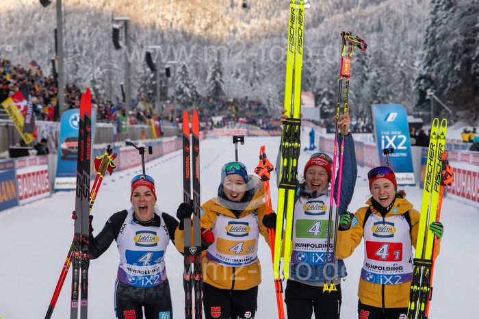 Jubel und Freude bei der deutschen Staffel über den 3th Platz, v.l. Hanna Kebinger (GER), Franziska Preuss (GER), Sophia Schneider (GER) und Janina Hettich-Walz (GER).