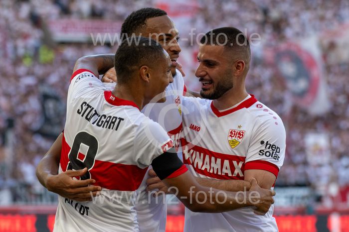 Torjubel des Torschützen Jamie Leweling, Jubel und Freude bei Enzo Millot und Deniz Undav (VfB Stuttgart).