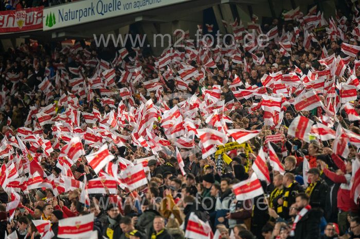 Feature, Symbolbild, gute Stimmung im Stadion VfB-Fans mit Fahnen.