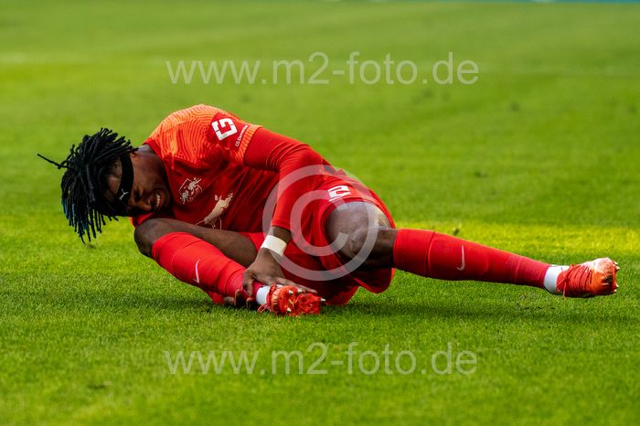 Mohamed Simakam (RB Leipzig) liegt verletzt am Boden.