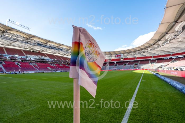 Feature, Symbolbild, Blick in die Mercedes-Benz Arena, mit Regenbogenfarbenen Eckfahne und VfB-Wappen.