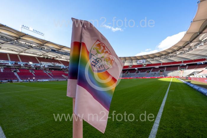 Feature, Symbolbild, Blick in die Mercedes-Benz Arena, mit Regenbogenfarbenen Eckfahne und VfB-Wappen.