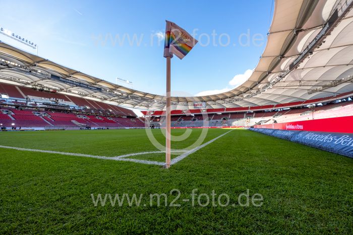 Feature, Symbolbild, Blick in die Mercedes-Benz Arena, mit Regenbogenfarbenen Eckfahne und VfB-Wappen.