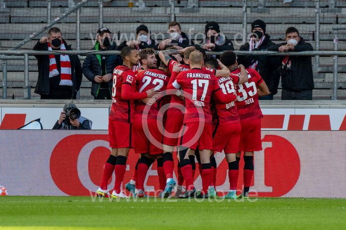 Frankfurter Torjubel, Djibril Sow, Timothy Chandler, Sebastian Rode, Torschütze Evan Obite Ndicka, Rafael Borre und Lucas Silva Melo (Eintracht Frankfurt).