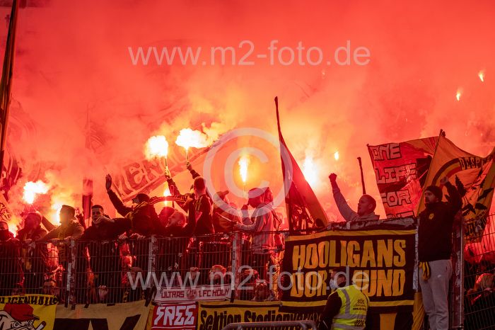 Bengalos, Pyrotechnik, Rauch steigt auf im BVB Fanblock.