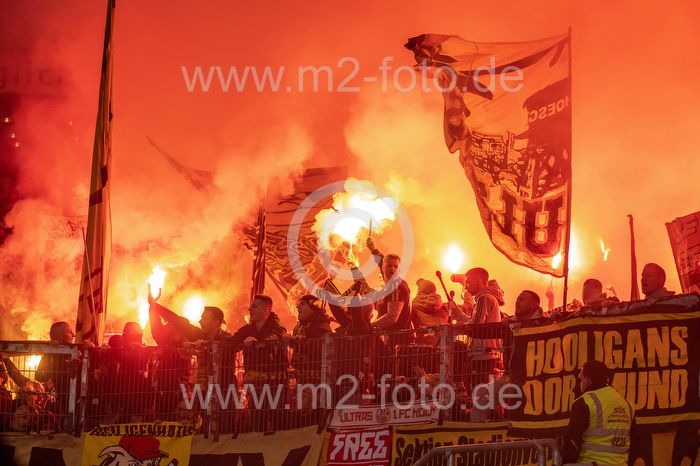 Bengalos, Pyrotechnik, Rauch steigt auf im BVB Fanblock.