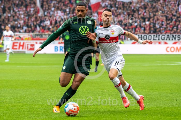 Maxence Lacroix (VfL Wolfsburg) im Zweikampf mit Erik Thommy (VfB Stuttgart).