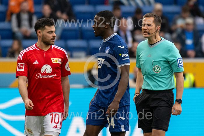 Kevin Volland (1.FC Union Berlin) und Stanley Nskoi (TSG 1899 Hoffenheim) im gemeinsamen Disput, Schiedsrichter Robert Hartmann geht dazwischen.