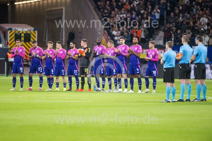 Die Nationalspieler klatschen zum Andenken an die Verstorbenen, v.l. Jamal Musiala (GER), Robert Andrich (GER), Joshua Kimmich (GER), Florian Wirtz (GER), Ilkay Gündogan (GER), Torwart Marc-Andre ter Stegen (GER), Antonio Rüdiger (GER), Toni Kroos (GER), Kai Havertz (GER), Johnathan Tah (GER) und Maximilian Mittelstädt (GER).