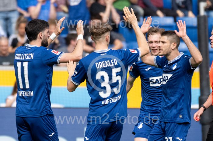 Torjubel des Torschützen Andrej Kramaric (TSG 1899 Hoffenheim), Jubel und Freude bei Florian Grillitsch, Tim Drexler und Maximilian Beier (TSG 1899 Hoffenheim).
