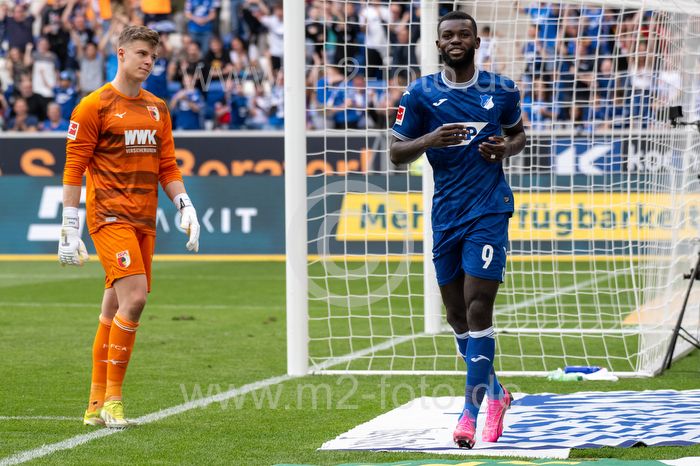 Torjubel des Torschützen Ihlas Bebou (TSG 1899 Hoffenheim),Torwart Finn Dahmen (FC Augsburg).